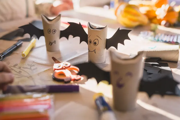 Även om butikerna är fulla av läskiga halloweendekorationer är det både roligt och enkelt att göra egna dekorationer. Ett bra tips är att spara på tomma toarullar. De gör sig nämligen bra som både Frankenstein och söta fladdermöss. Det sistnämnda är barnens favorit, så här är det bara att förbereda sig på att pyntet kommer att finnas kvar ett tag.