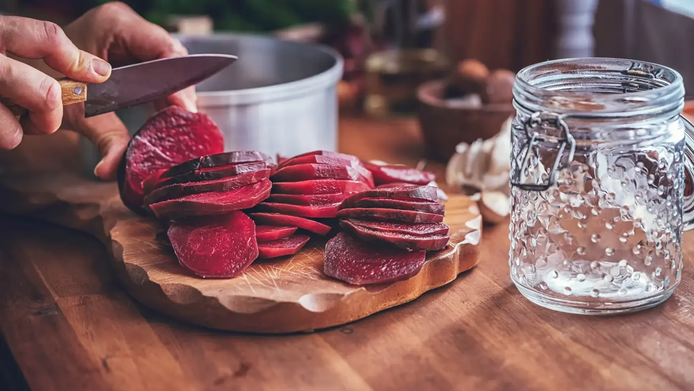 - Koka upp äppelcidervinäger, strösocker och vatten. Häll den varma lagen över rödbetsskivorna och låt dra i minst 6 timmar.