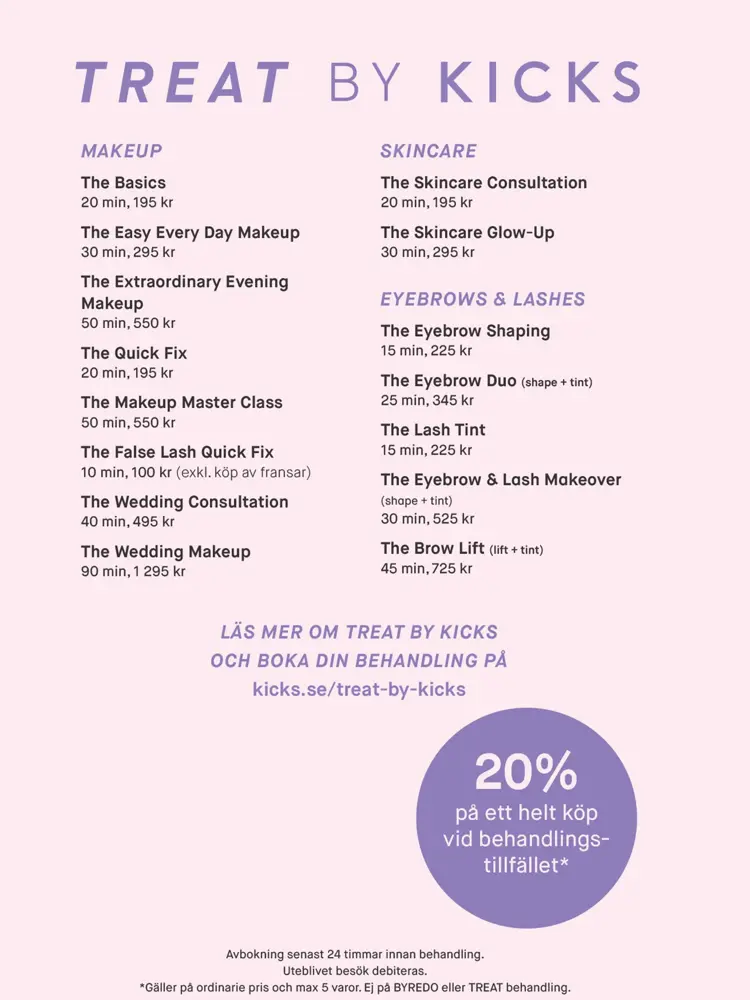 Ibland handlar det bara om dig. Treat by KICKS är våra beautybehandlingar som sätter fokus på dig och vad du vill ha, just idag. Ett brow lift? Hjälp att fästa lösfransar? Eller bröllopsmakeup? Våra utbildade beautyexperter är alltid redo att ta hand om dig och dina önskemål.